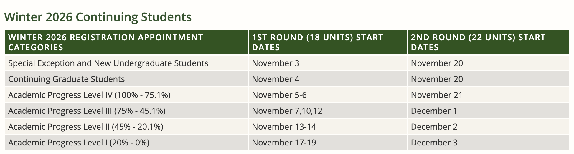 November 3rd starts Priority Registration. Stop by anytime between 10am and 2pm on that day to ask questions and get help with registration.