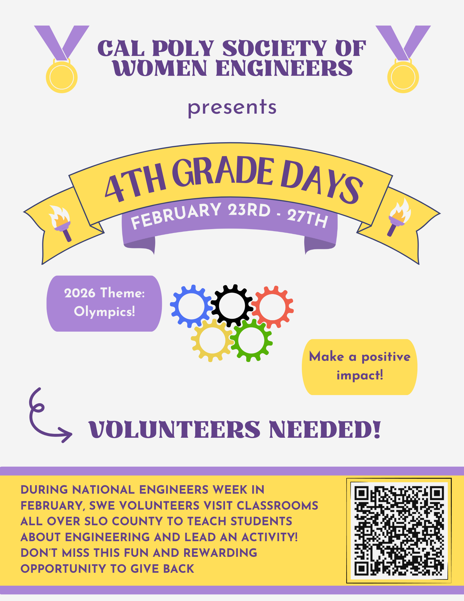 Fourth Grade Days will be during National Engineering Week from February 23rd to February 27th where we will be visiting over 60 fourth grade classrooms throughout SLO County to teach students about engineering and lead a fun hands-on activity. Please sign up using the QR code or link to the Sign Up Form. If you have any questions email cpsweelementary@gmail.com.