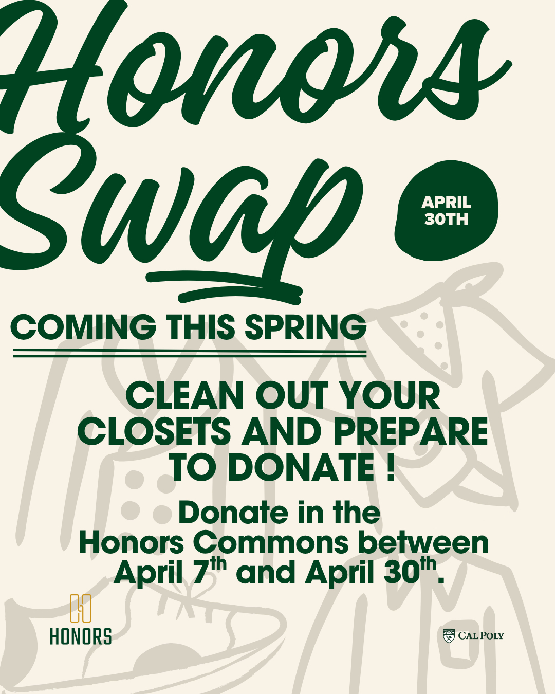 Donate gently used clothes, browse what others have donated, and take anything you want to wear. It's like a little thrift shop, but FREE! Honors Swap is a simple way to practice sustainability, refresh your wardrobe, and support the community. BRING IT TO THE COMMONS!
