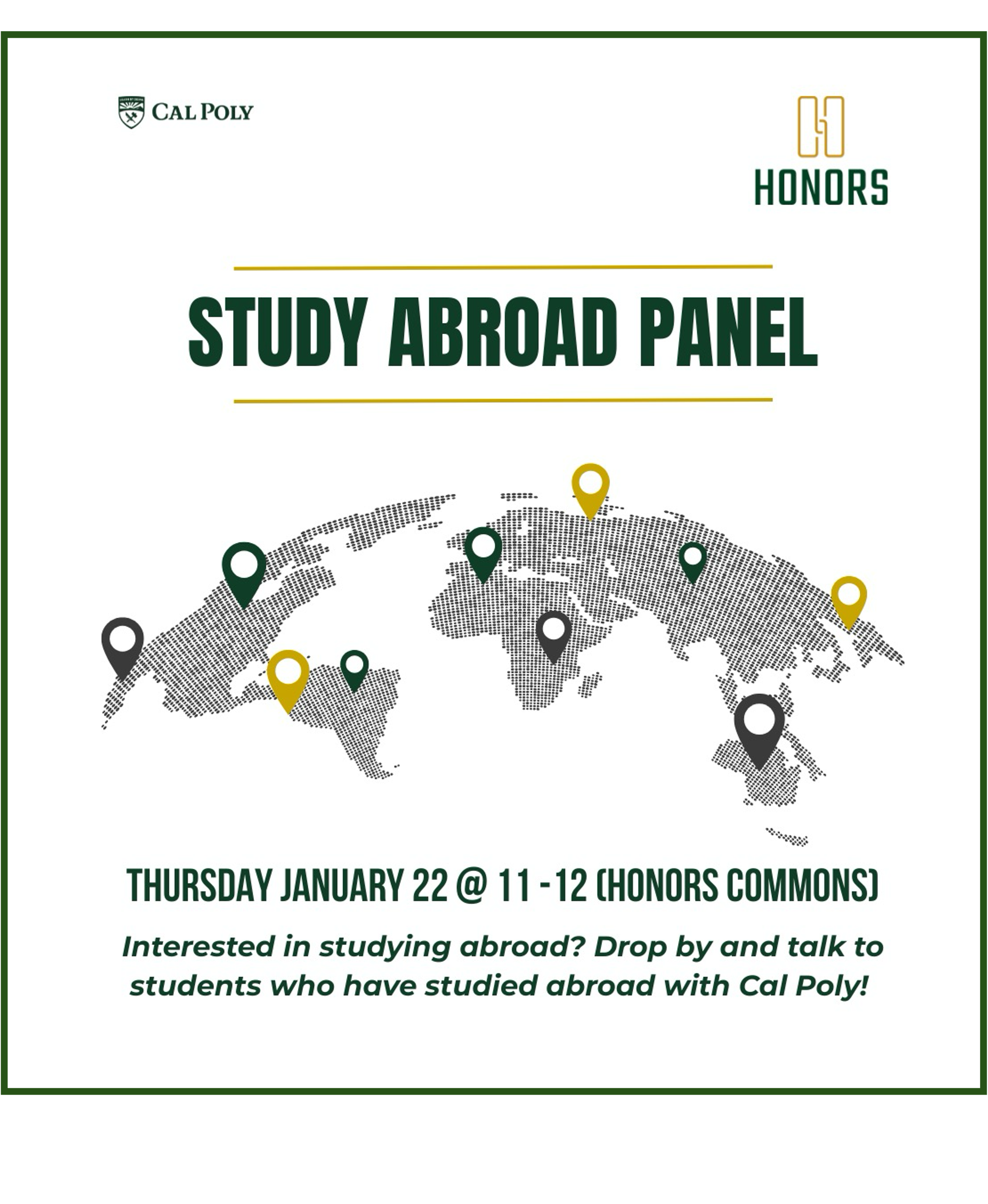 If you have questions about study abroad a good place to start is with our Honors Study Abroad Peer Advisor!