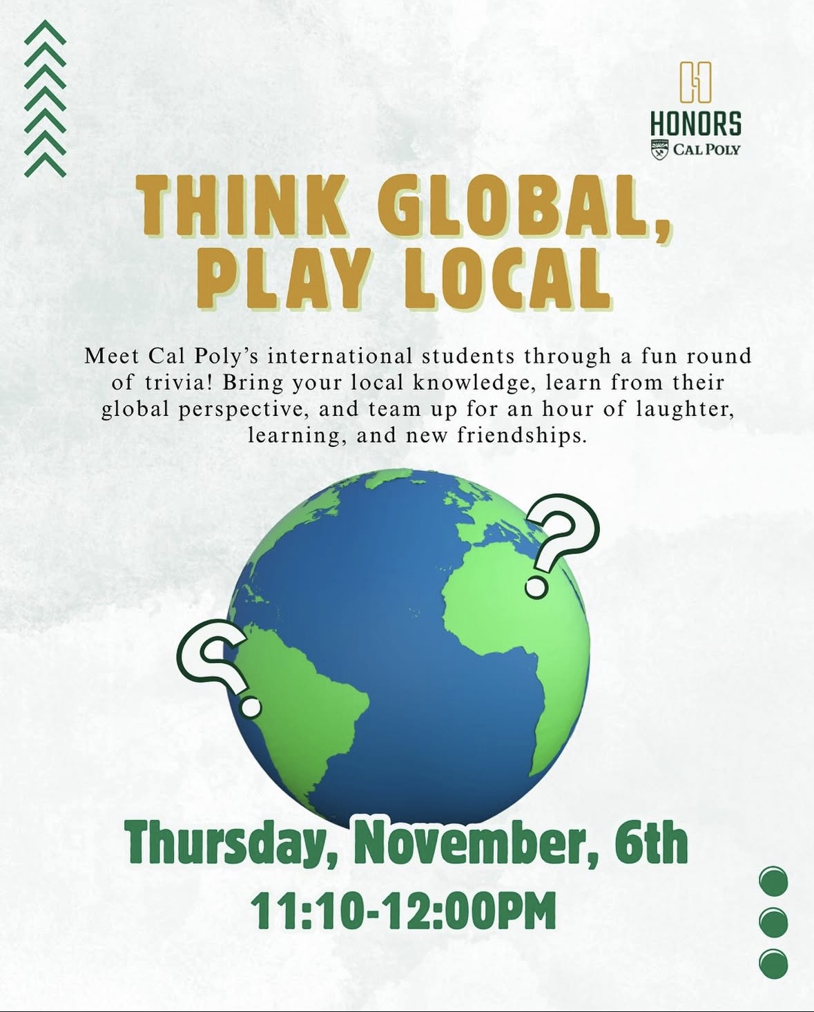 Honors has started a NEW tradition of inviting Cal Poly's international exchange students to be visiting members of Honors while they are at Cal Poly. We have 10 wonderful students who will be with us this year. Come to the Commons this Thursday at 11:10 to meet our students over a round of Trivia. What happens when you have a team of US and Non-US students on a team?? Come find out! And make a new friend while you are at it.