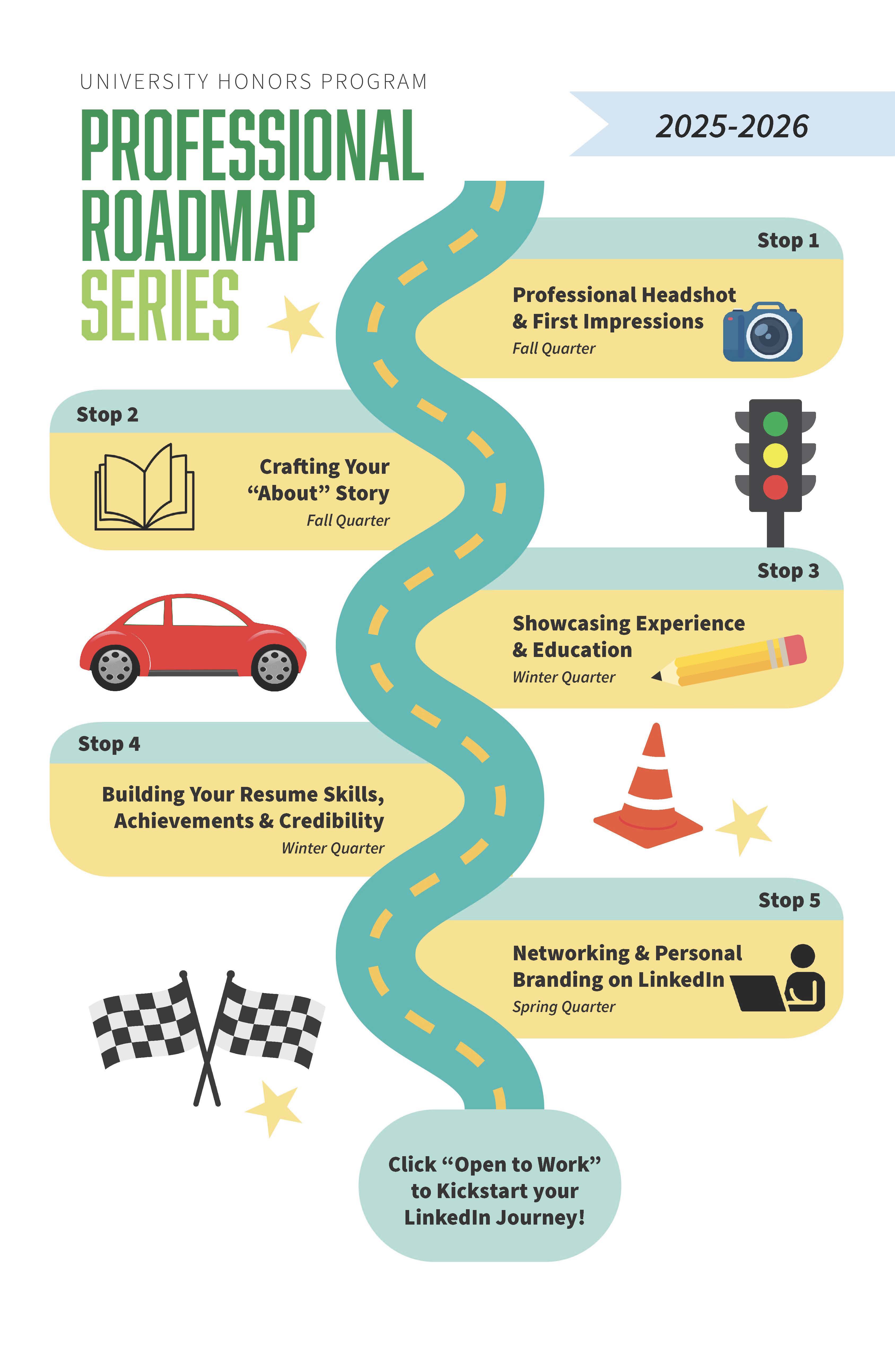 Each year Honors holds a series of Professional Development events throughout the academic year with a particular goal to help you. This year our series will focus on optimizing your LinkedIn page! Check out the events planned for the rest of the year!